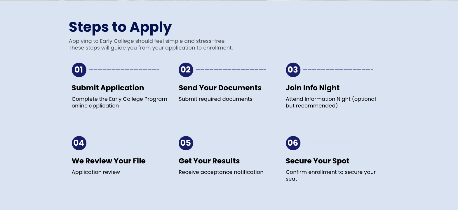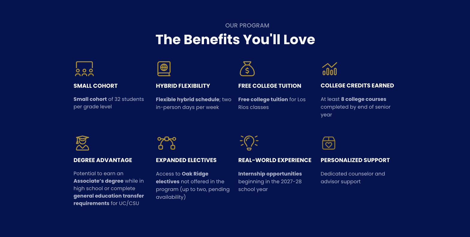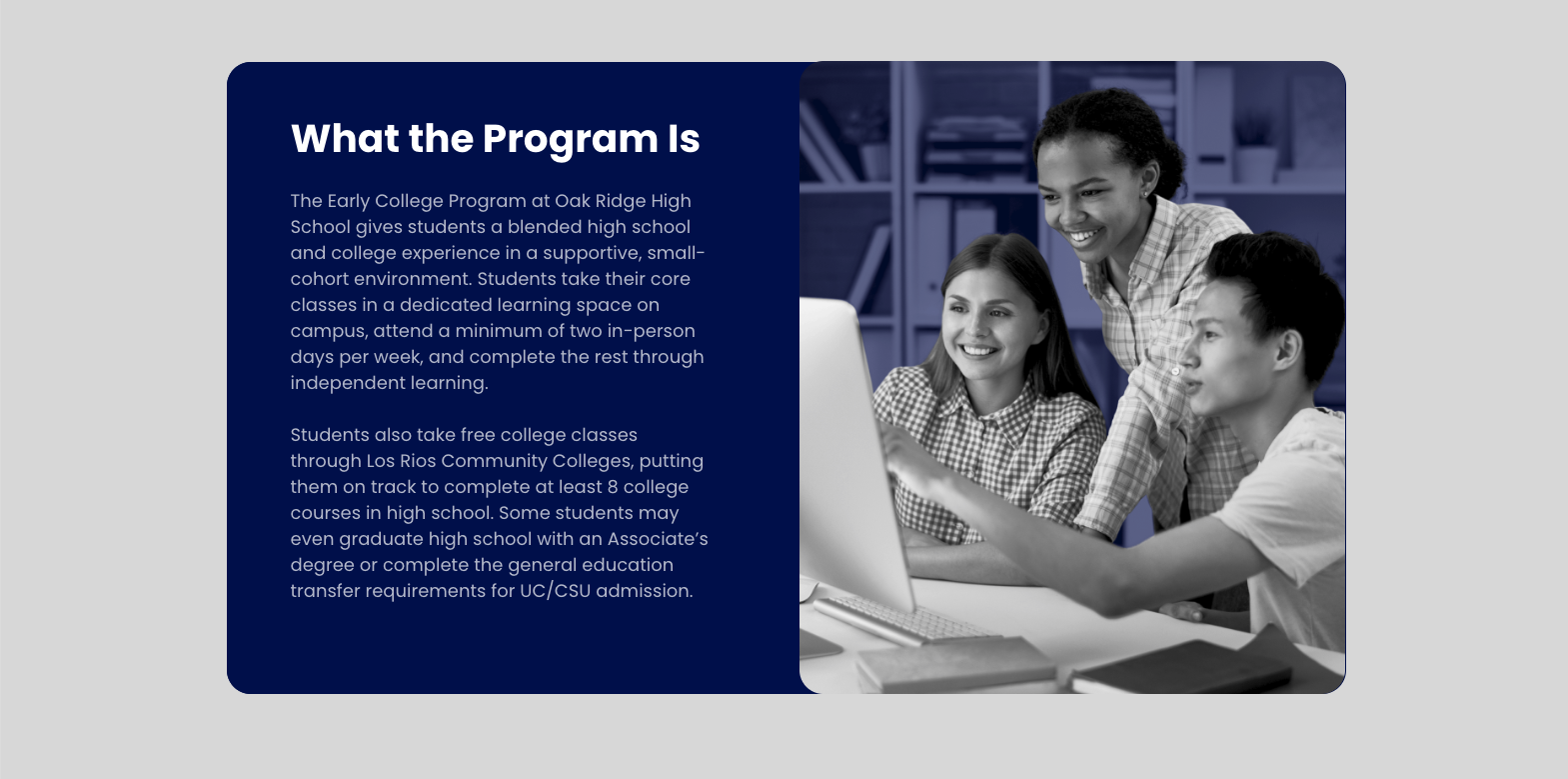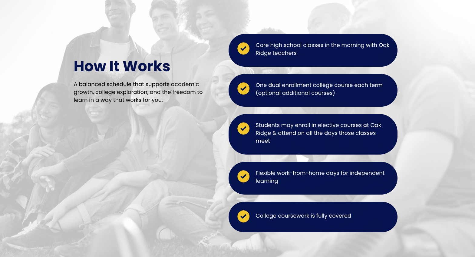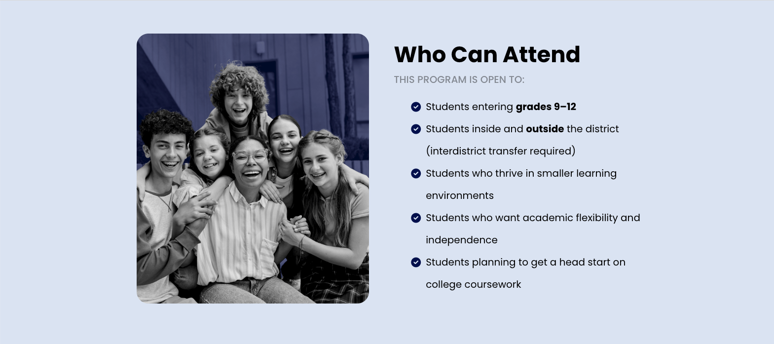 A small, flexible hybrid program where motivated students earn high school credits and free college credits at the same time.